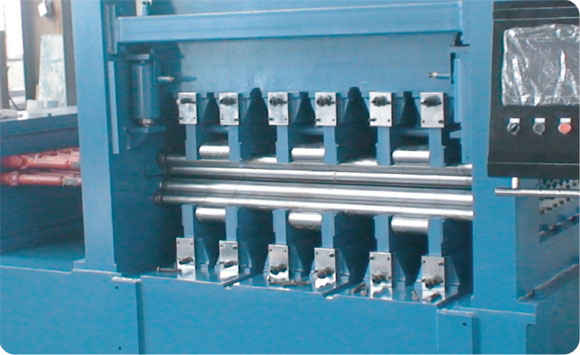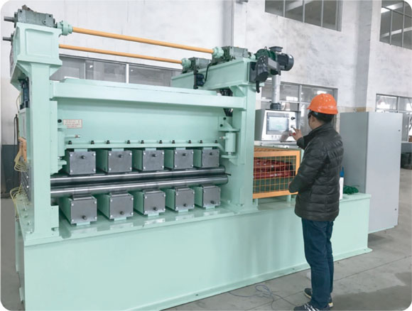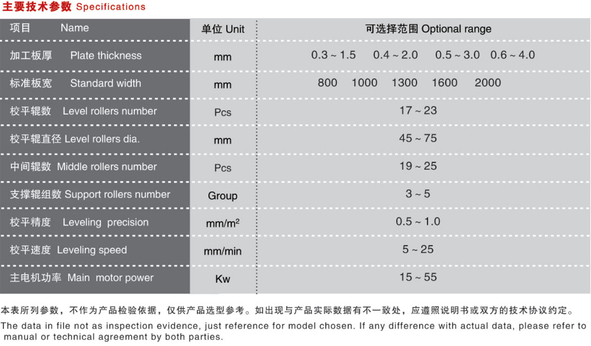本機(jī)床是四重式校平機(jī)的升級機(jī)型。在上、下排校平工作輥與支撐輥(輪)之間各加裝進(jìn)一排中間輥,構(gòu)成上下各三重,共六重的組輥結(jié)構(gòu)。通過中間輥的過渡,支撐輥(輪)的支撐力不直接作用于工作輥,避免了四重式校平機(jī)工作時(shí),在敏感材料表面留下支撐輥(輪)壓痕的現(xiàn)象,最大程度地保護(hù)加工材料的表面狀態(tài)。主要用于校平鋁板、不銹鋼板、銅板、有色金屬板、不同金屬復(fù)合板,涂、鍍、磨工藝金屬板等對板表面要求較高的板材。校平輥受力分布均勻,結(jié)構(gòu)剛性好,工作輥繞曲變形小,校平精度高。